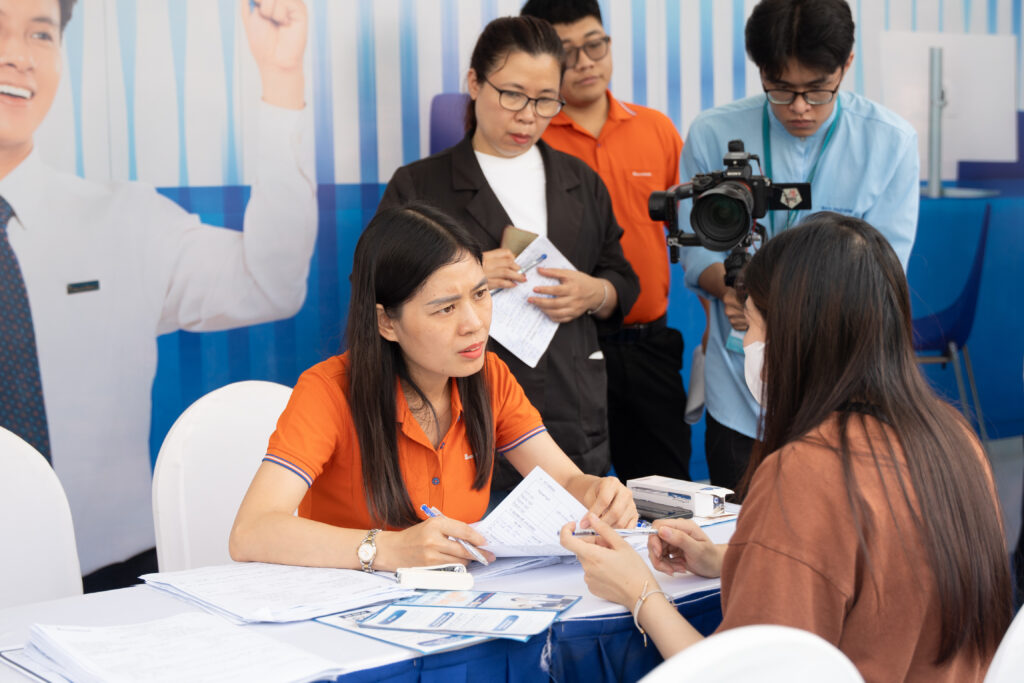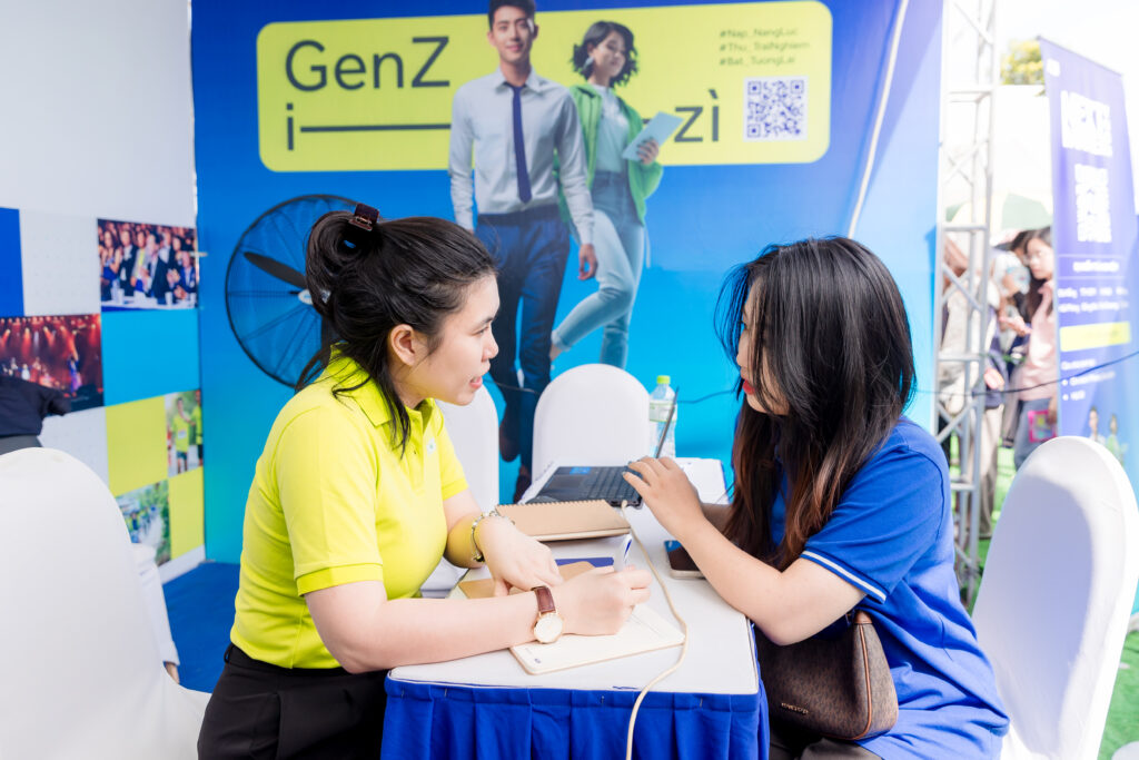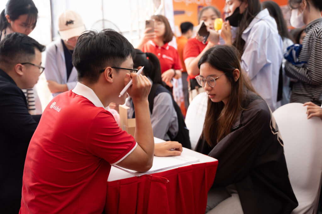 Không khí sôi nổi tại khu vực tư vấn nghề nghiệp – nơi sinh viên được định hướng và chia sẻ kỹ năng ứng tuyển.