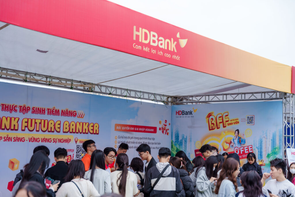 Các sinh viên lắng nghe tư vấn trực tiếp từ đại diện HDBank về chương trình “HDBANK FUTURE BANKER” và các cơ hội nghề nghiệp hấp dẫn tại ngân hàng.