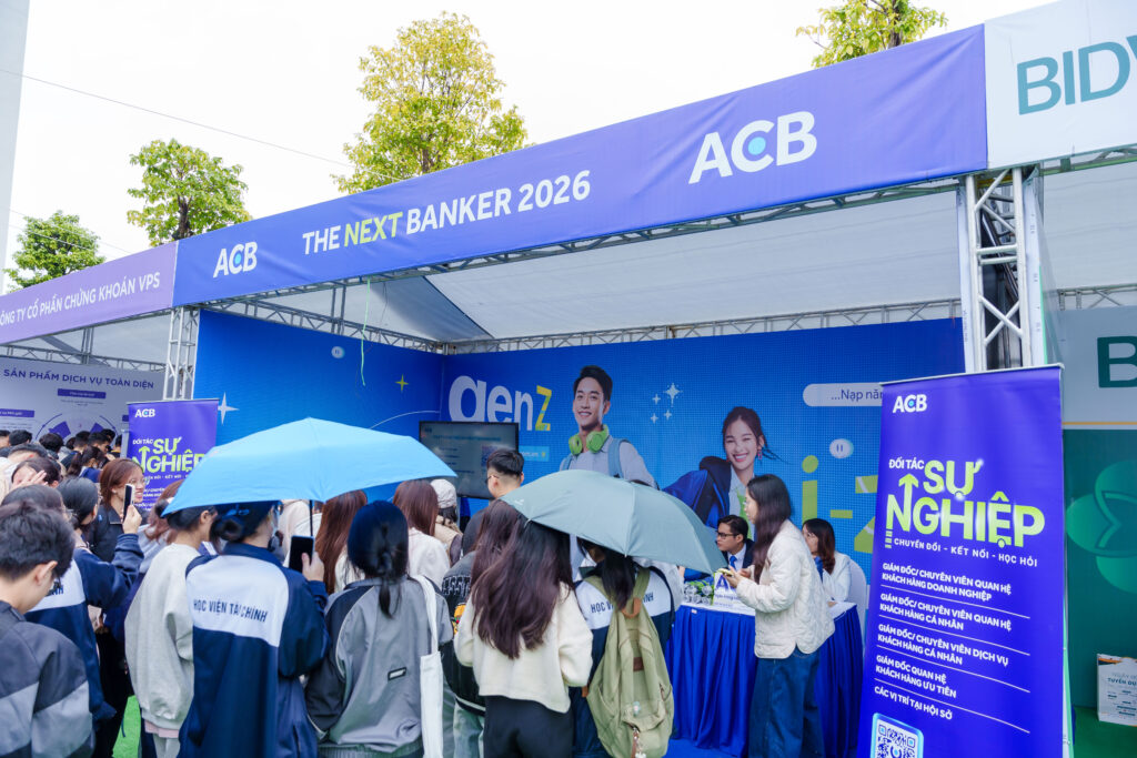 Gian hàng của Ngân hàng Á Châu (ACB) nổi bật với chương trình “THE NEXT BANKER 2026”, thu hút đông đảo ứng viên tiềm năng đến tư vấn và nộp hồ sơ.
